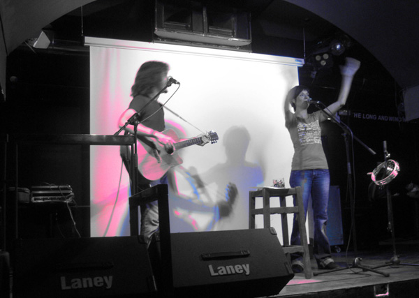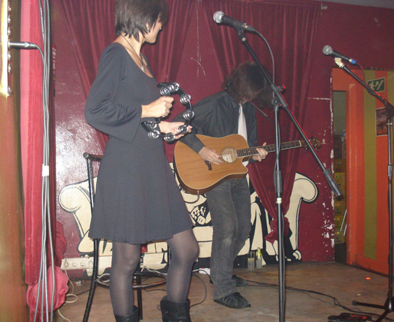 Inés y Richi en el primer concierto acústico a la carta de Slumber 9. Consistía en que había una lista de 49 canciones y cada asistente debía marcar la que quería oír. De las 28 que marcaron conseguimos hacer 26 (las otras dos no las hicimos porque no había más tiempo).